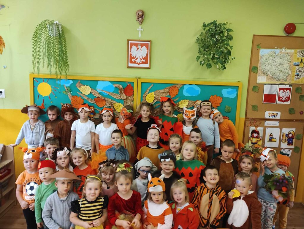 19.10.2023r. Tego dnia zorganizowany został Bal Jesieni. W tym szczególnym dniu dzieci przybyły do przedszkola przebrane za zwierzęta leśne, oraz warzywa. Przedszkolaki tańczyły przy jesiennych piosenkach i brały udział w konkursach. Były między innymi podawanie dyni z rąk do rąk, segregowanie kasztanów i orzechów, oraz zbieranie warzyw i owoców. Podczas zabawy zostali wybrani król i królowa balu (Mikołaj S. i Hania K.). Wszystkie dzieci za wspólną zabawę otrzymały słodki upominek. Odbył się również pokaz mody ekologicznej. Na terenie ogrodu przedszkolnego posadziliśmy drzewo upamiętniając przy tym Międzynarodowy Dzień Drzewa. Był to dzień, który na długo zostanie w naszych pamięciach.