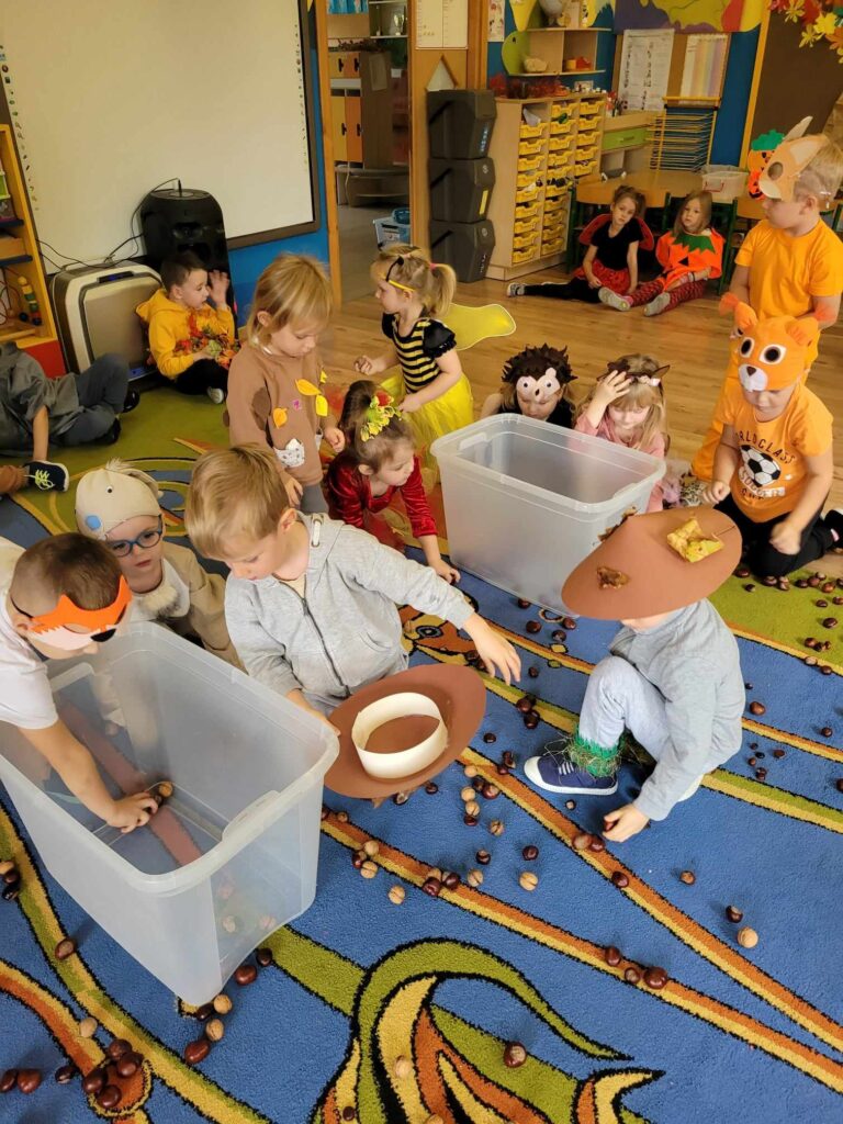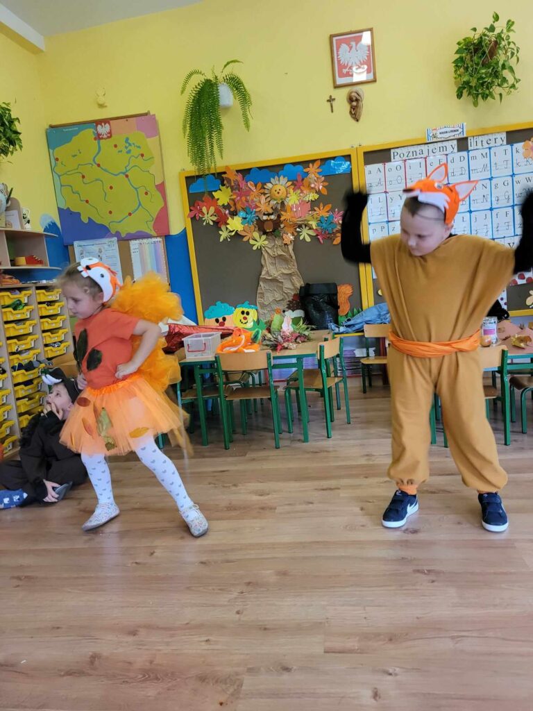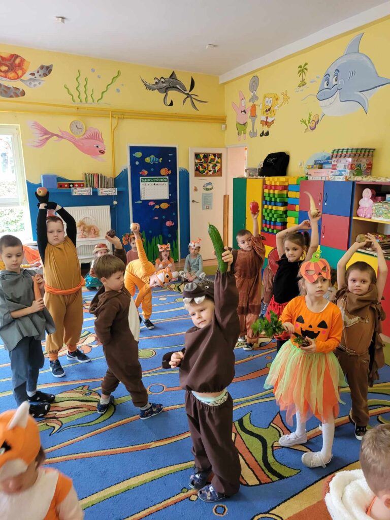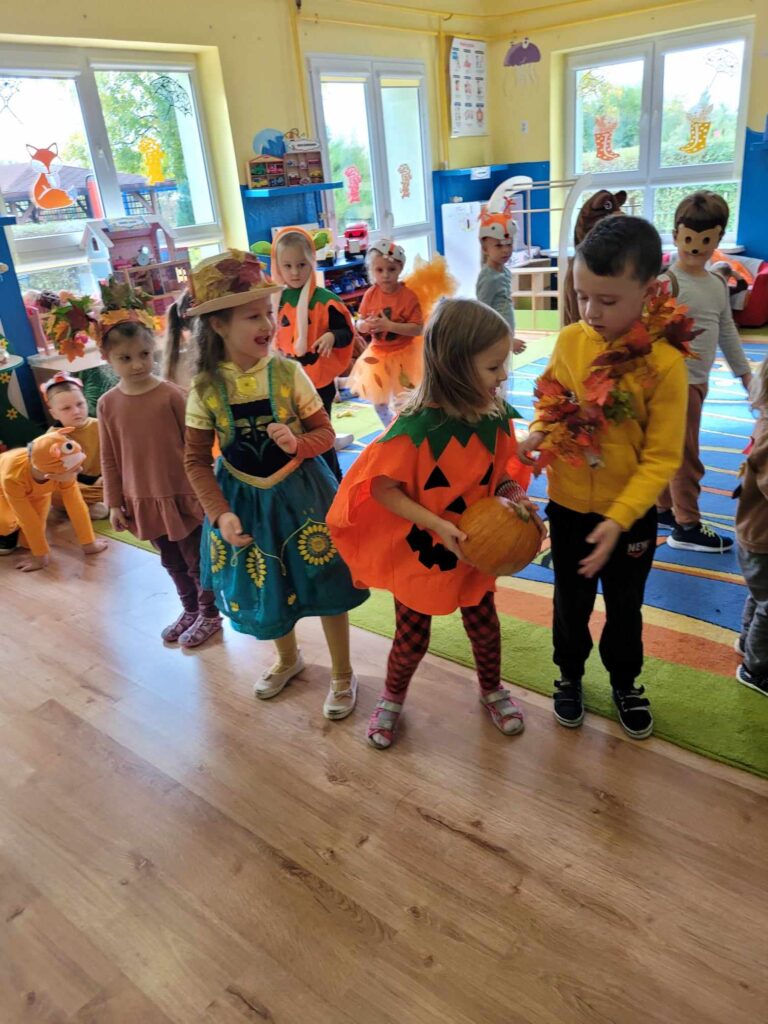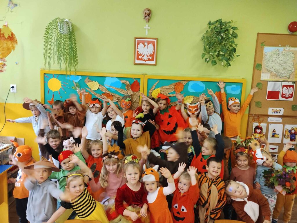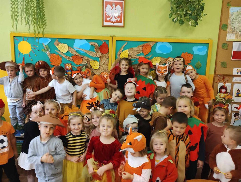 19.10.2023r. Tego dnia zorganizowany został Bal Jesieni. W tym szczególnym dniu dzieci przybyły do przedszkola przebrane za zwierzęta leśne, oraz warzywa. Przedszkolaki tańczyły przy jesiennych piosenkach i brały udział w konkursach. Były między innymi podawanie dyni z rąk do rąk, segregowanie kasztanów i orzechów, oraz zbieranie warzyw i owoców. Podczas zabawy zostali wybrani król i królowa balu (Mikołaj S. i Hania K.). Wszystkie dzieci za wspólną zabawę otrzymały słodki upominek. Odbył się również pokaz mody ekologicznej. Na terenie ogrodu przedszkolnego posadziliśmy drzewo upamiętniając przy tym Międzynarodowy Dzień Drzewa. Był to dzień, który na długo zostanie w naszych pamięciach.