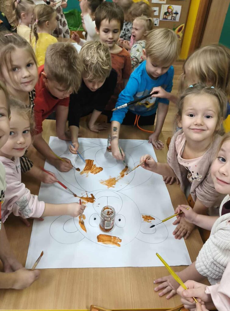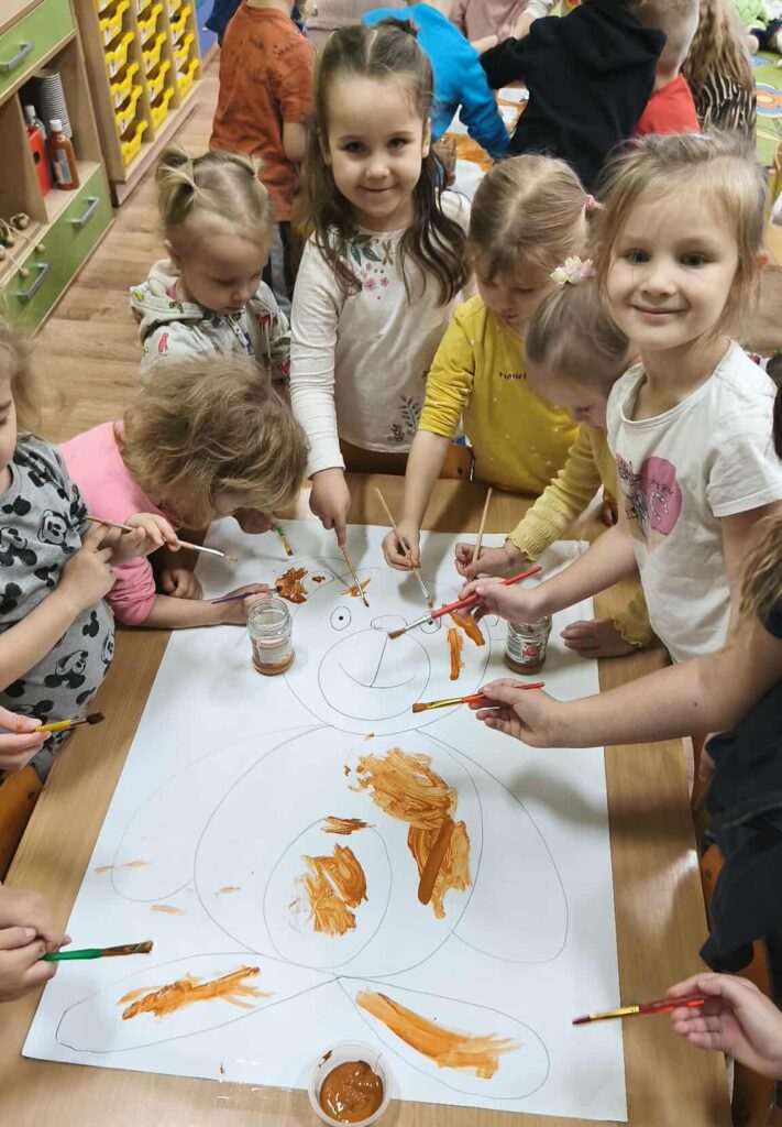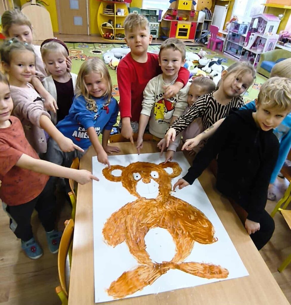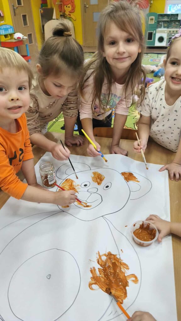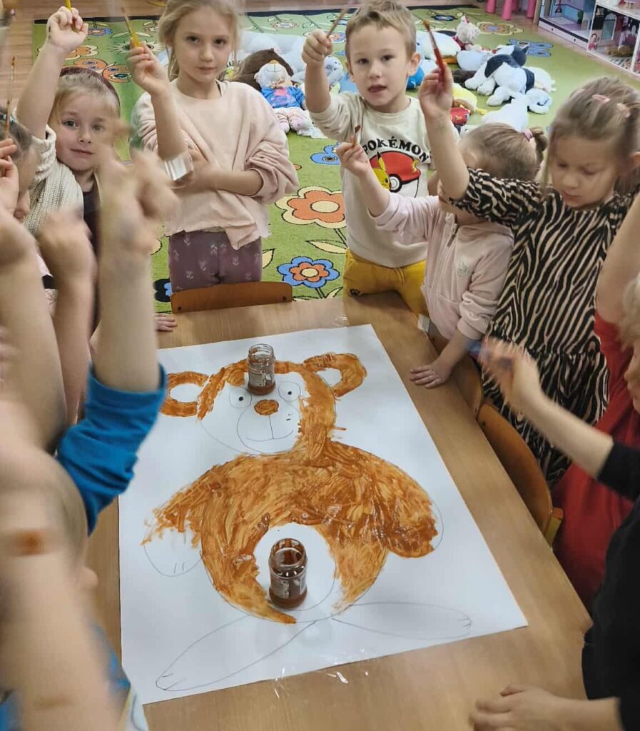 Nie zabrakło konkursów, zgadywanek i wesołych zabaw, które wywołały mnóstwo śmiechu. Na zakończenie wszyscy zabrali się do wspólnego tworzenia – kolorowych Misiów XXL, zamieniając ogromne kontury w kolorowe dzieła sztuki pełne fantazji.