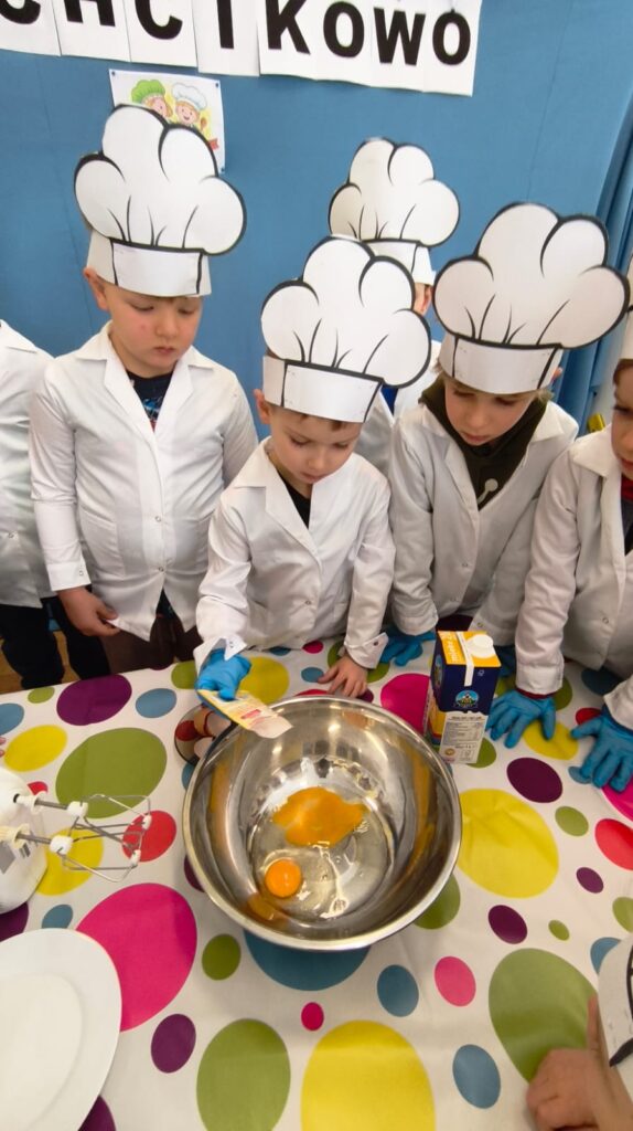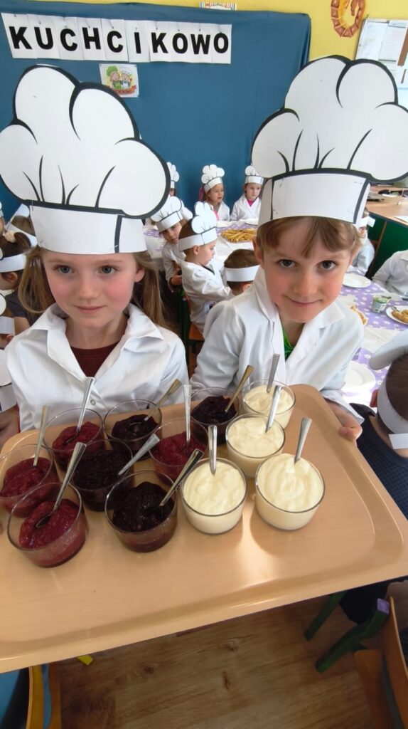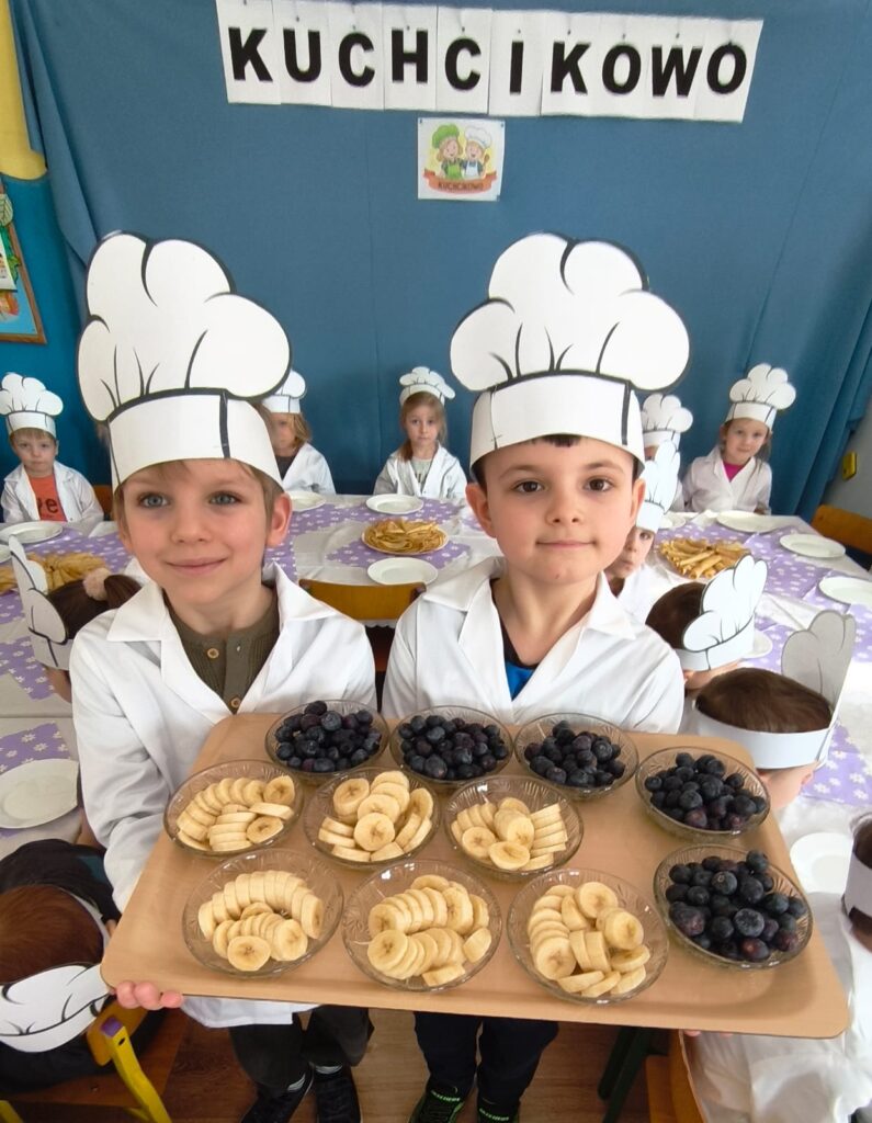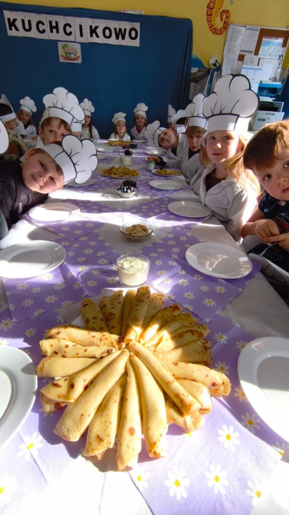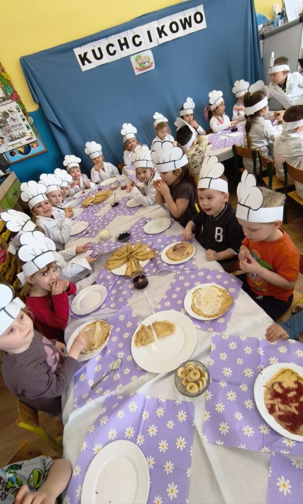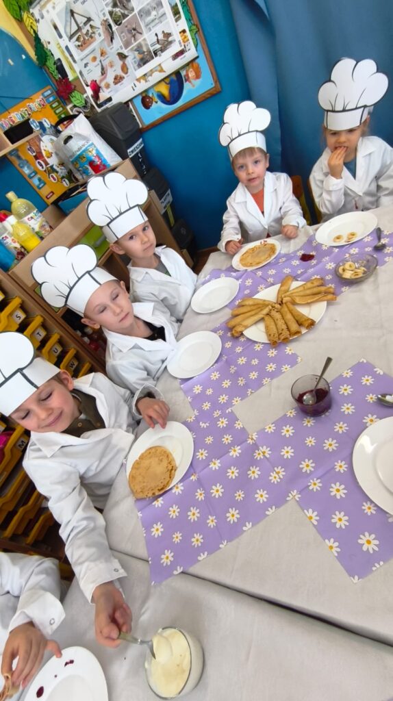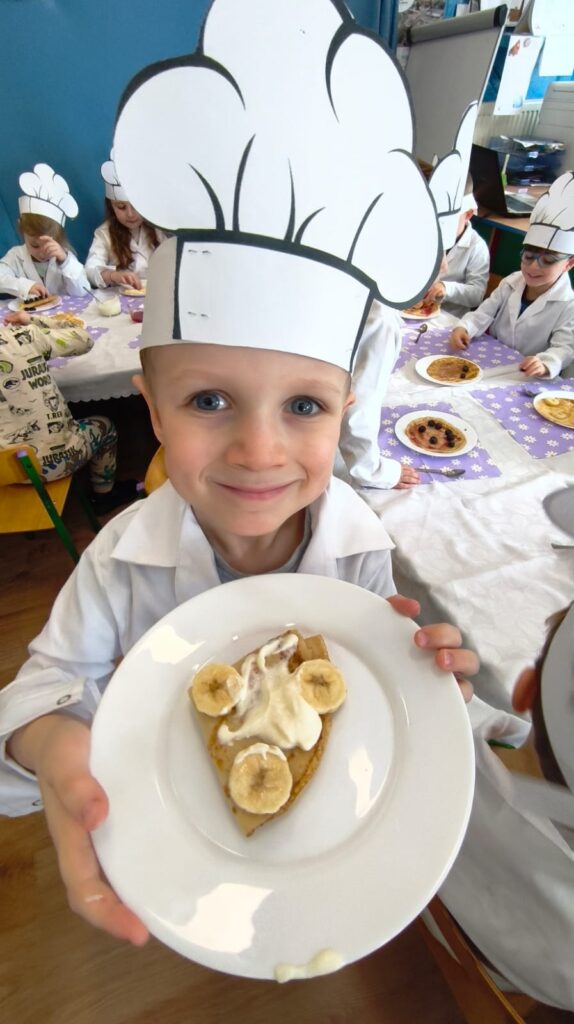z marmoladą, z owocami, a może z serkiem? Każdy smakował inaczej, ale wszystkie były pyszne i słodkie. Dzieci uczestniczyły w całym procesie tworzenia naleśników od początku: od przygotowania składników, przez mieszanie ciasta, aż po dekorowanie swoich małych dzieł. To była wyjątkowo smakowita i pełna radości kulinarna przygoda!