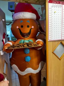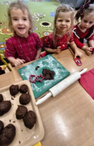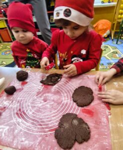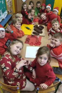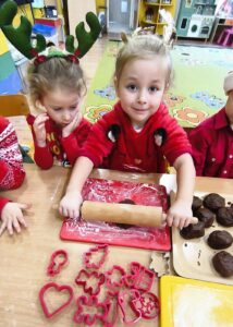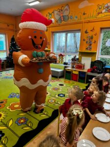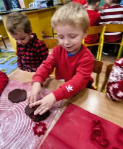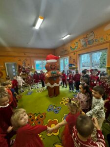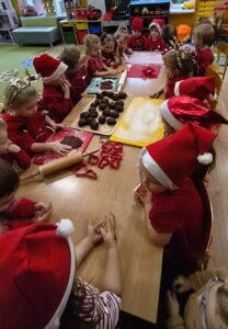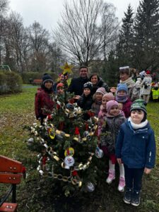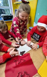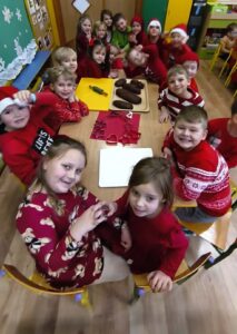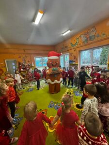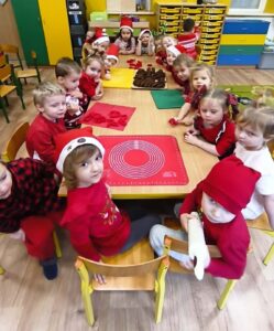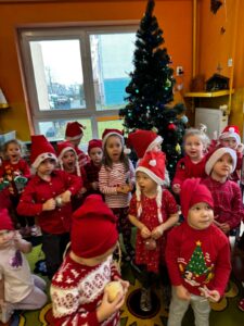 i własnoręcznie wykonane ozdoby sprawiły, że każda sala nabrała wyjątkowego, świątecznego klimatu. Następnie dzieci udały się do przedszkolnej kuchni, gdzie piekły aromatyczne pierniki. Po upieczeniu ciasteczek przystąpiły do ich dekorowania – używały lukru, posypek i kolorowych dodatków, tworząc prawdziwe małe dzieła sztuki. W trakcie zajęć dzieci odwiedził wesoły Ciastek, a chwilę później do przedszkola zawitała Zgraja Mikołaja wraz z Panem Wójtem Piotrem Chałupką. Spotkanie obfitowało we wspólne zabawy, tańce i słodkości, które sprawiły dzieciom ogromną radość. Na zakończenie dnia reprezentacja przedszkola udała się pod Gminny Dom Kultury w Ksawerowie, aby wspólnie ubrać choinkę. Dzięki dziecięcej kreatywności drzewko nabrało wyjątkowego uroku i stało się symbolem zbliżających się Świąt Bożego Narodzenia. Tego dnia wszystkie dzieci były ubrane na czerwono, co dodatkowo podkreśliło świąteczny charakter wydarzenia i nadało mu wyjątkowego klimatu. Był to dzień pełen emocji, kreatywnościi wspólnej zabawy. Dekorowanie choinek, pieczenie pierników, spotkanie z wyjątkowymi gośćmi oraz udział w ubieraniu choinki pod Domem Kultury pozostaną w pamięci dzieci jako piękne wspomnienie grudniowych przygotowań.