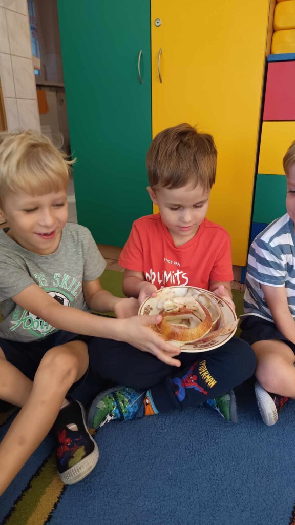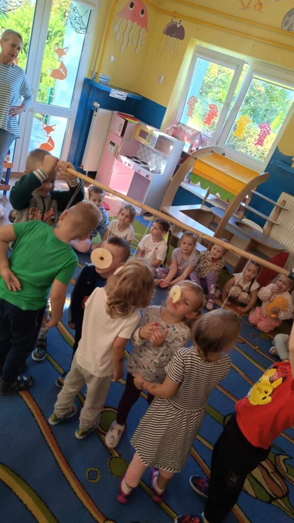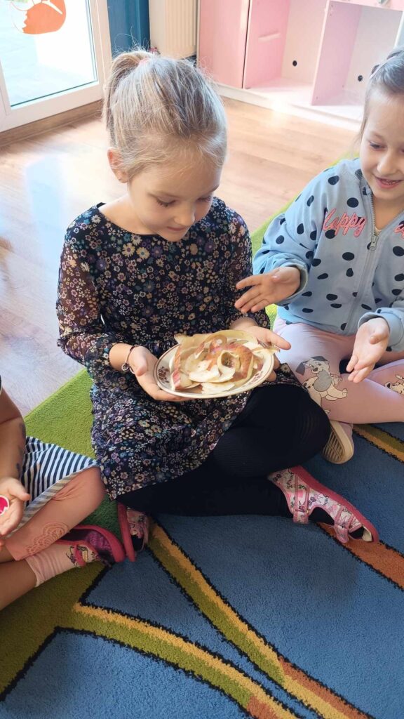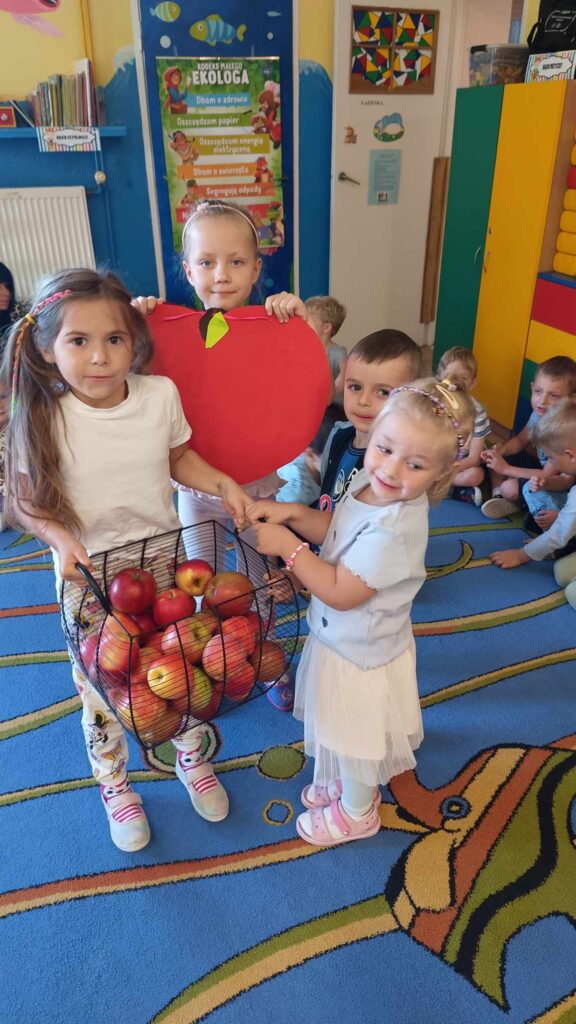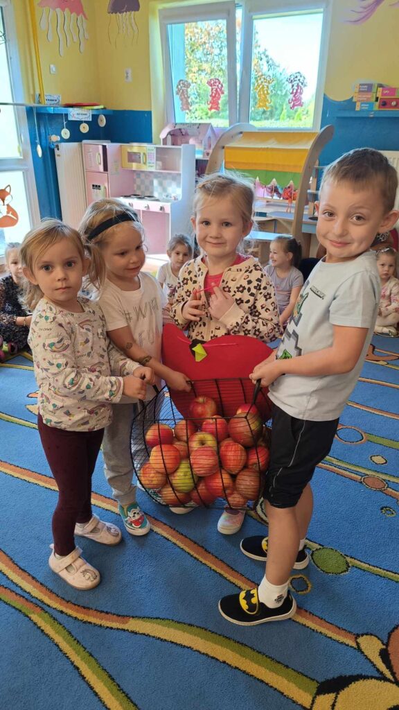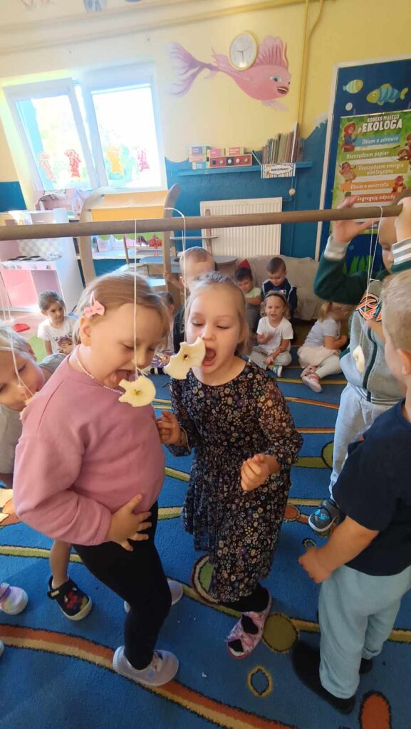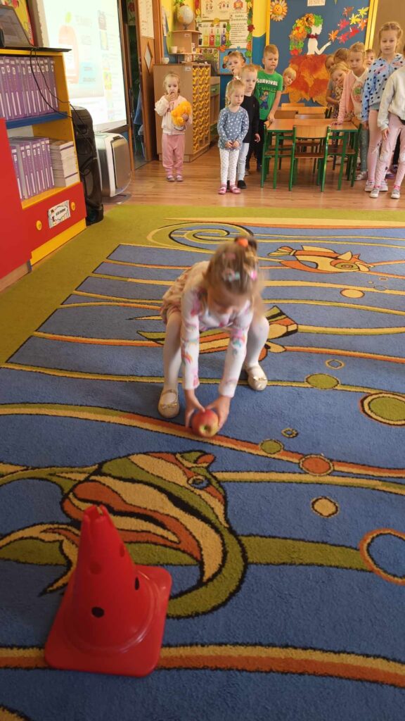 Dzieci pełne zainteresowania i ciekawości przystąpiły do mycia owoców , później już pozostało wrzucenie ich do sokowirówki i sok gotowy. Następnie dzieci wzięły udział w zabawach z wykorzystaniem jabłka. Z ogromnym zaangażowaniem i chęcią dzieci wspólnie się bawiły oraz rywalizowały ze sobą podczas konkurencji sportowych. Dzisiejszy dzień był przepełniony witaminami oraz ruchem.