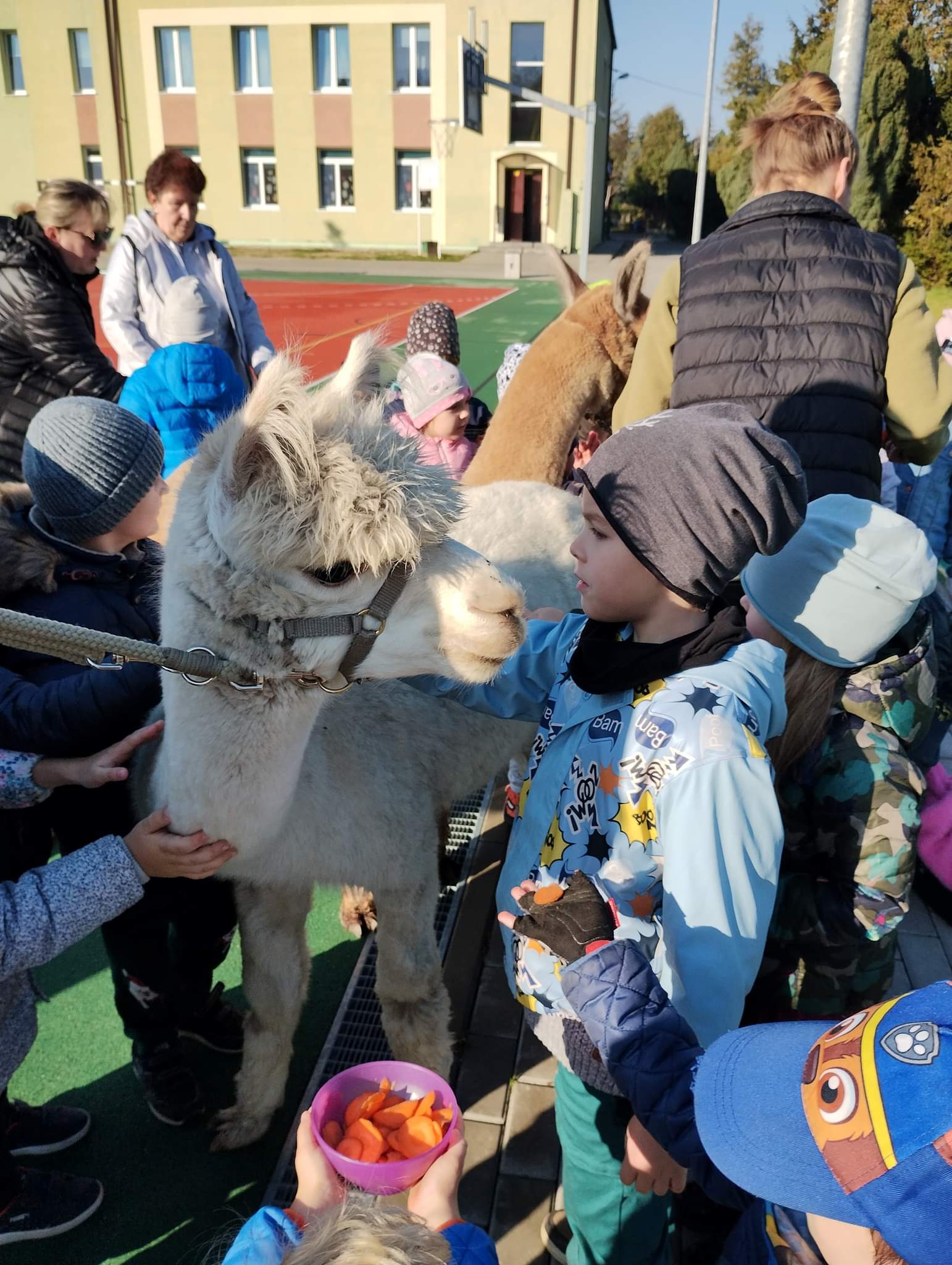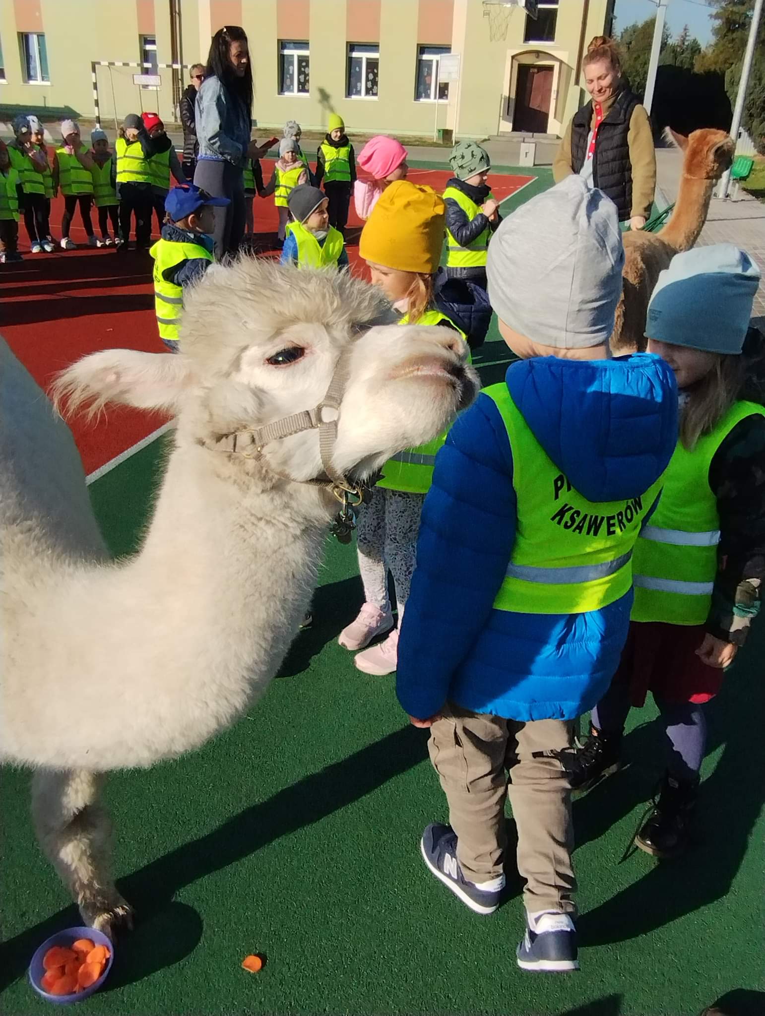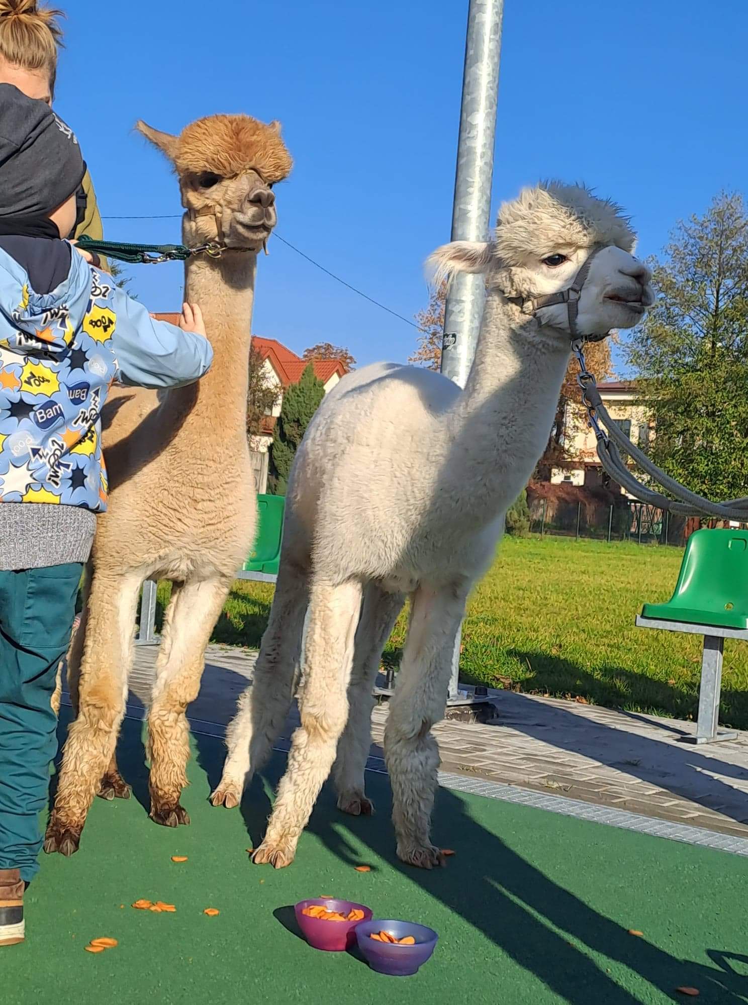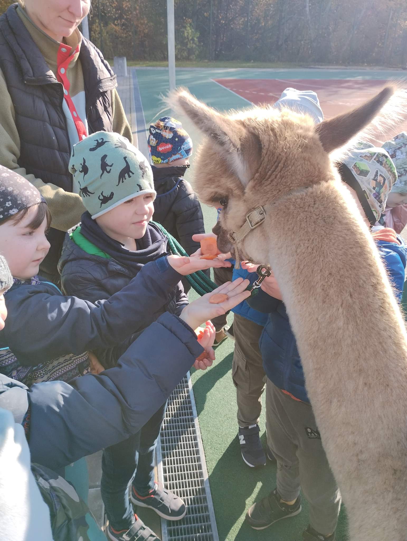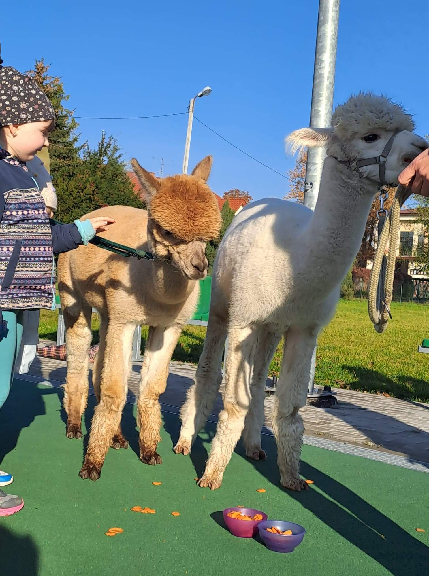 27.10.2022r. Przedszkolaki wybrały się do Szkoły Podstawowej w Ksawerowie na spotkanie z przesłodkimi alpakami- Lenkiem i Vitem. Opiekunowie alpak opowiedzieli dzieciom o zwyczajach i upodobaniach tych łagodnych i trochę płochliwych zwierząt. Po krótkim wykładzie przyszedł czas na praktykę. Dzieci mogły pogłaskać nowych przyjaciół, nakarmić marchewką. Na koniec spotkania chętne dzieci przytulały sympatyczne zwierzątka.