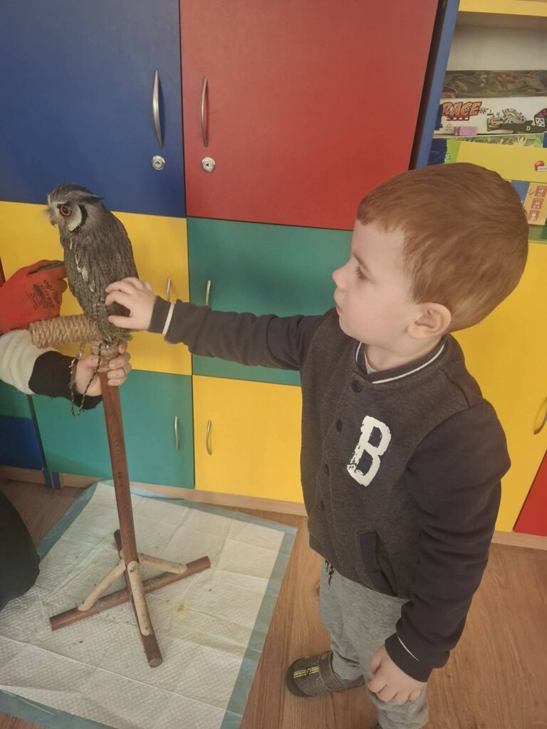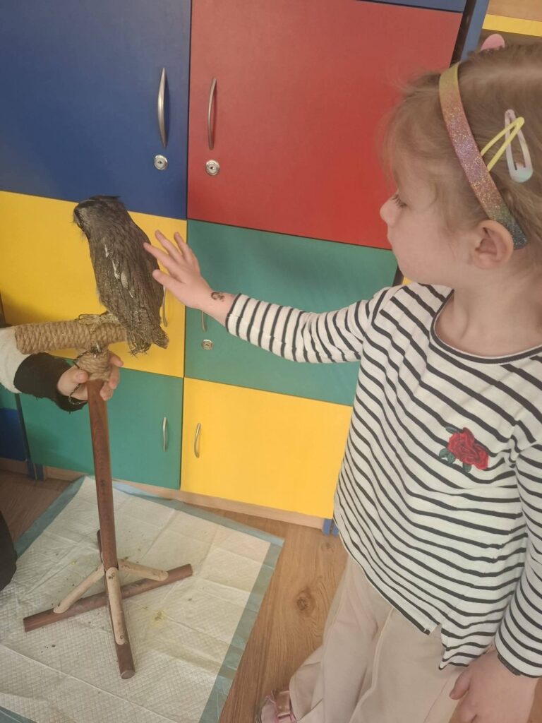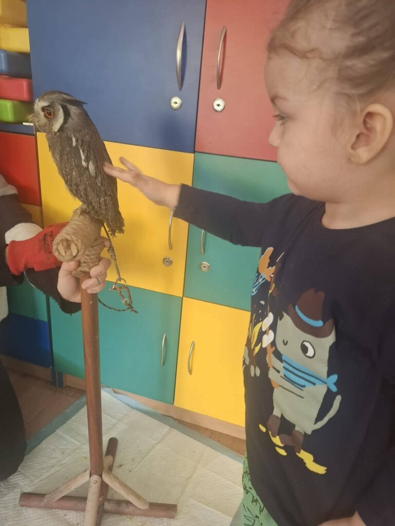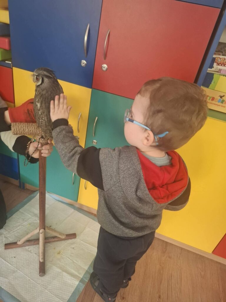 Podczas warsztatów, które odbyły się 02.03.2026, przedszkolaki miały wyjątkową okazję poznać z bliska fascynujący świat sów. Dzieci uczestniczyły w zajęciach prowadzonych przez edukatora przyrodniczego, który opowiadał